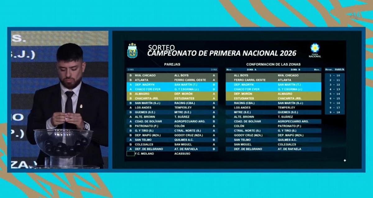 La Asociación del Fútbol Argentino sorteó las zonas para el campeonato de la Primera Nacional 2026. El formato será similar al de las últimas temporadas, a diferencia de que, en el certamen entrante, habrá fecha de interzonales. Comenzará el 7 de febrero.