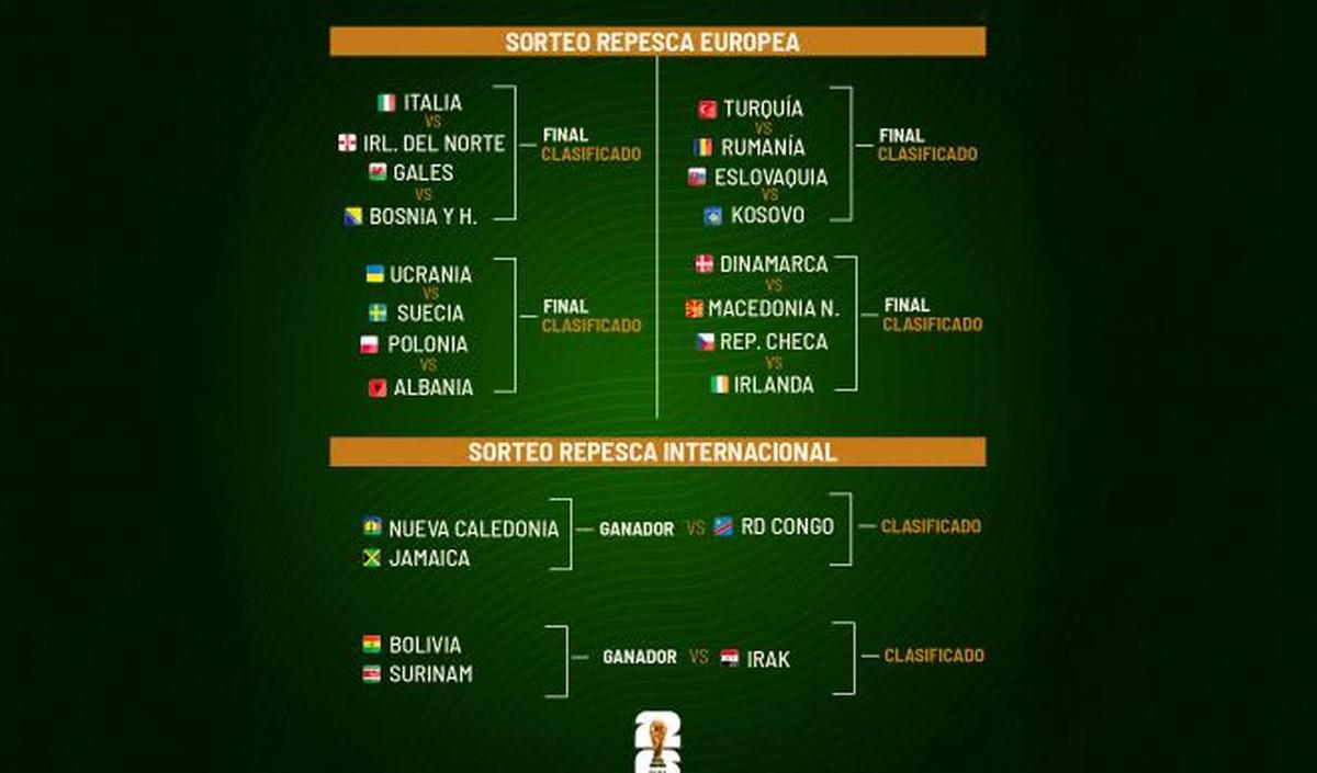 Por ejemplo, Italia ocupó el Bombo 1 y recibirá a Irlanda del Norte pero de ganar ya quedó resuelto que visitará al vencedor de Gales o Bosnia y Herzegovina por un lugar en la Copa del Mundo.