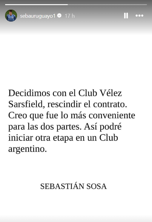 "Decidimos con el Club Vélez Sarsfield, rescindir el contrato. Creo que fue lo más conveniente para las dos partes. Así podré iniciar otra etapa en un Club argentino", expresó el oriundo de Uruguay en su cuenta oficial de Instagram.