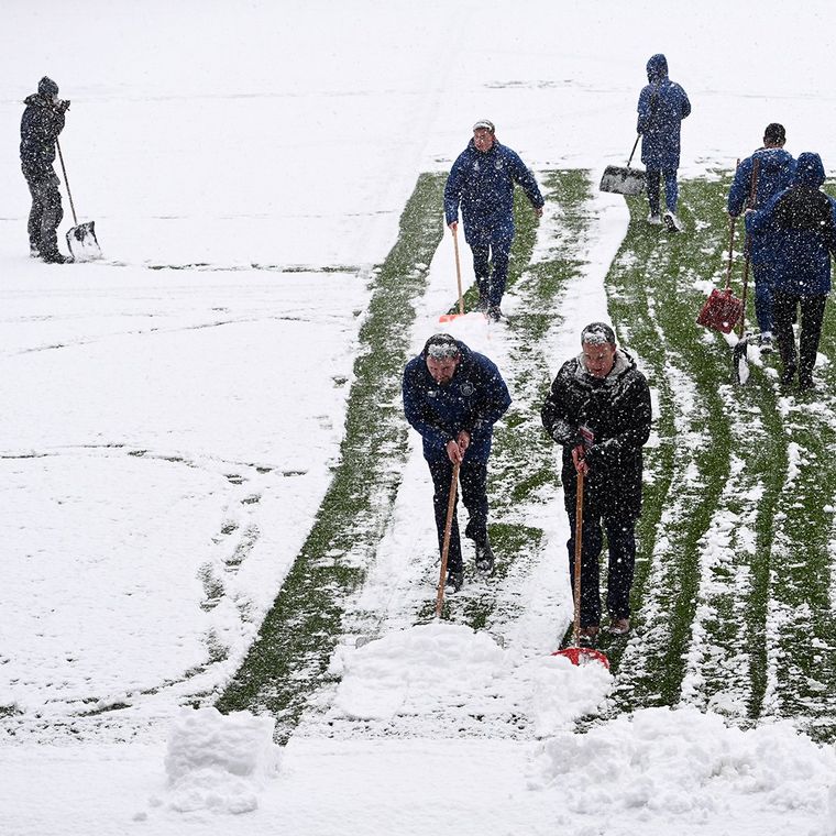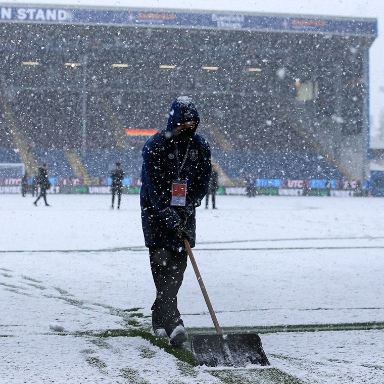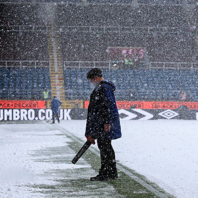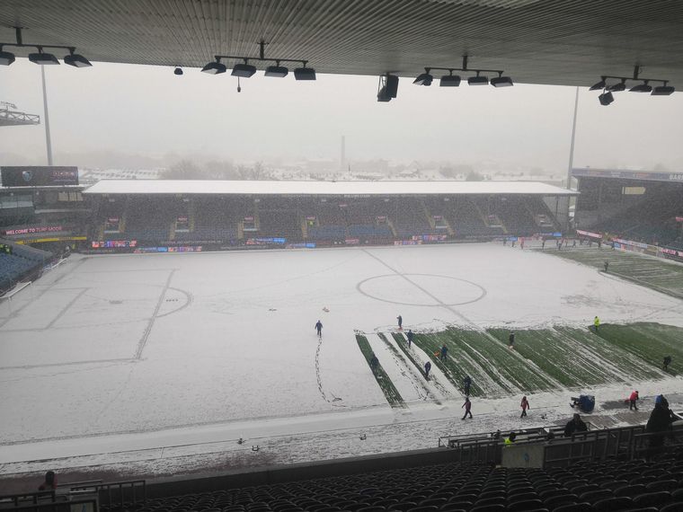 El partido fue aplazado por las complicadas condiciones climáticas luego que varios empleados del club local intentaron en vano sacar el gran manto blanco que cubría el campo de juego del estadio de Burnley.