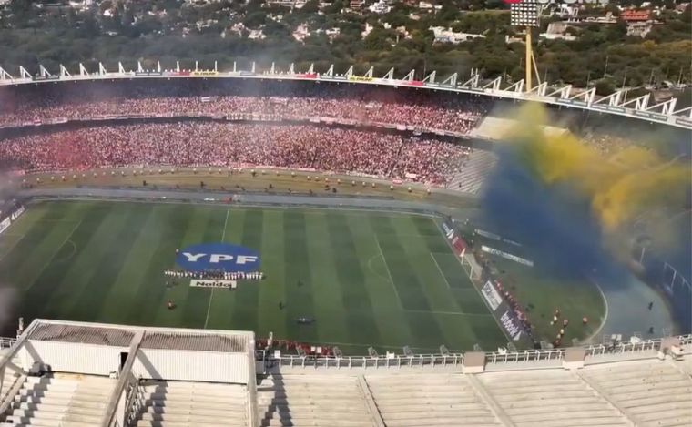 Con la salida de ambos equipos en conjunto, el estadio estalló y el clima llegó a su pico en territorio cordobés, donde un duelo entre el Millonario y el Xeneize vuelve a contar con simpatizantes de los dos elencos.