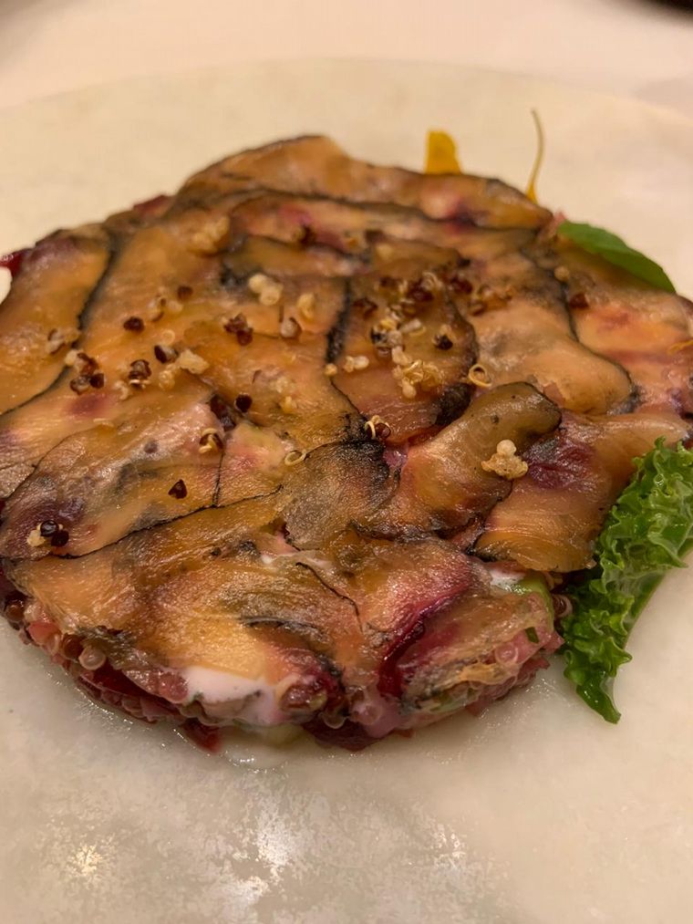 Entradas: salmón curado, cenizas, remolachas, pepino y quinoa frita; o capeletti de conejo, zuchinisy caldo de cocción.