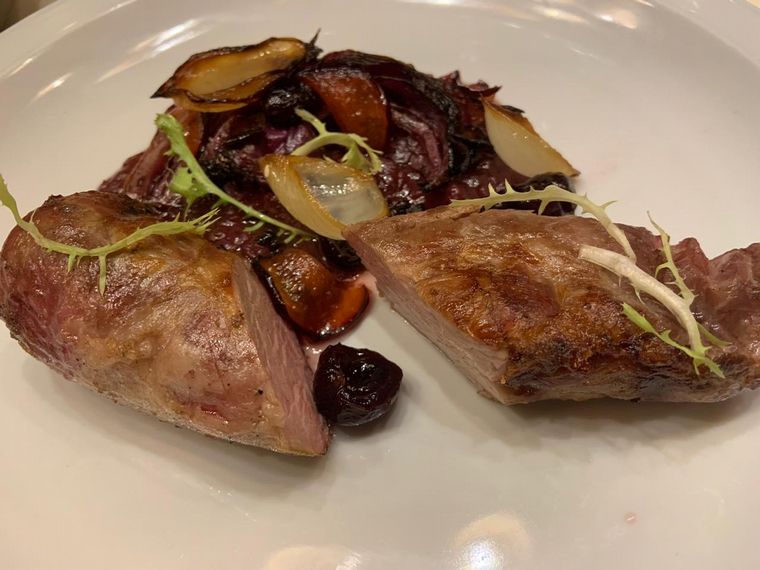 Plato principales: solmillo de cerdo, ciruelas, cerezas, repollo y cebollas asadas; o cuadril a las brasas, variedad de tomas, albahaca y mostaza.