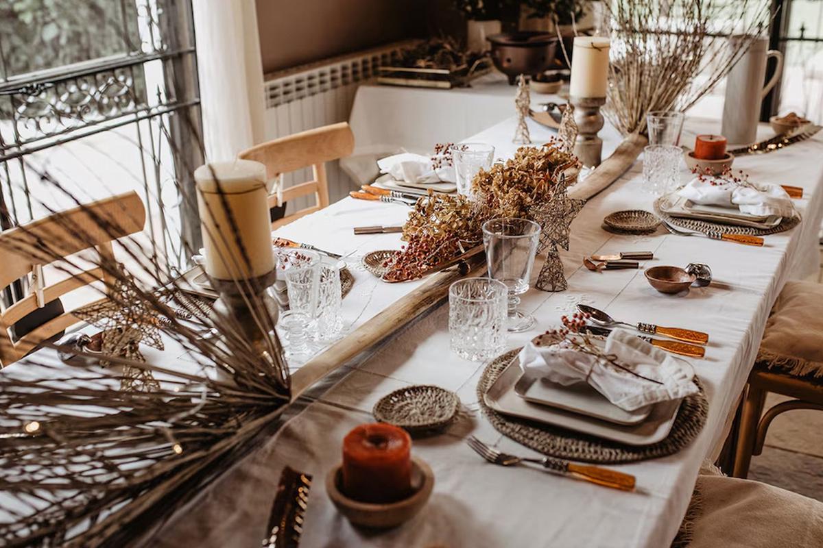 Una de las ideas más protagonistas este año es la decoración natural y orgánica. Se priorizan los manteles de lino o yute, en colores neutros como beige, blanco o verde oliva. Se pueden sumar piñas y ramitas de romero, de pino o de pequeñas flores secas.