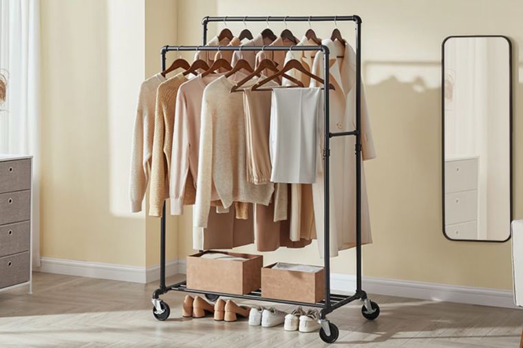 En dormitorios pequeños, donde un armario podría recargar demasiado el espacio, está la alternativa de los percheros metálicos para ordenar la ropa. Son estructuras simples, que pueden incluir unos cajones perfectos para las prendas interiores o las camisetas.