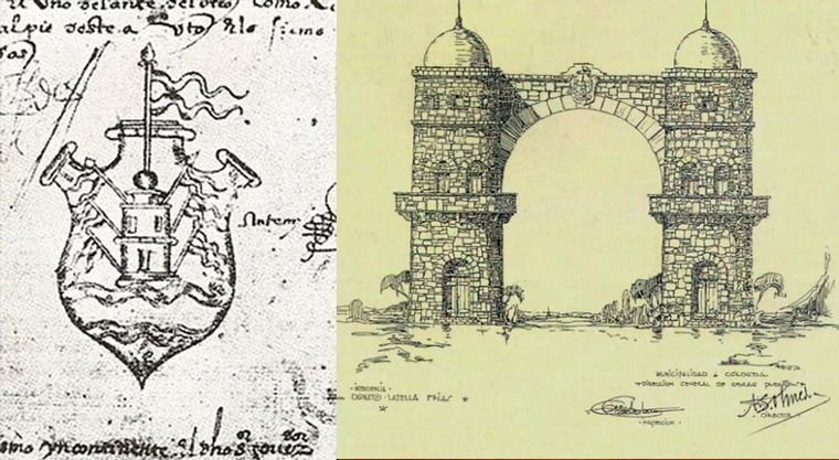 Primer escudo de Córdoba creado por el escribano Francisco de Torres (1573) y el bosquejo inicial del Arco (1942) (Grupo Edisur / Foto: Archivo fotográfico de Córdoba).
