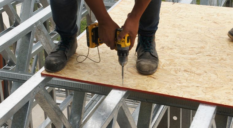 Las placas de OSB se envuelven en una membrana de viento y agua que las protege de las inclemencias del tiempo (Grupo Edisur / Foto: SteelPlex).