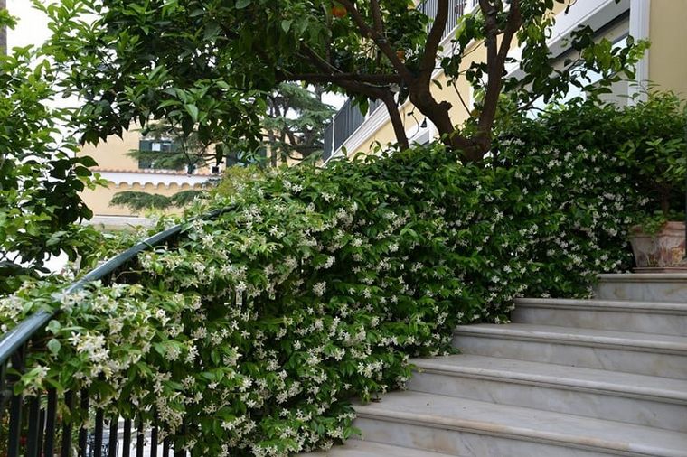 Trachelospermum jasminoides: puede tolerar algo de sombra, aunque se encuentra mucho más a gusto en emplazamientos soleados. Es una trepadora que no pierde la hoja en invierno y en primavera se llena de flores blancas muy aromáticas. Además, ensancha poco, lo que la hace ideal para jardines pequeños.
