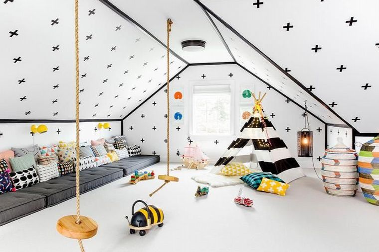 El playroom debe ser muy colorido y alegre. Para ello, se pueden utilizar tonos impactantes, combinar colores pasteles o usar opciones neutras con detalles llamativos.