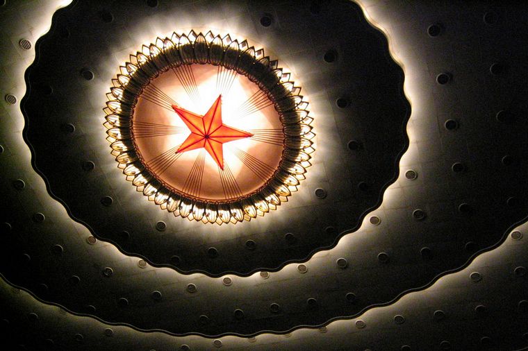 El techo del Gran Salón está decorado con una galaxia de luces con una gran estrella roja en el centro. Wikipedia.