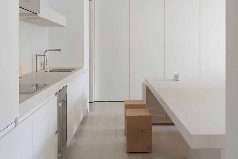 Colocar un mobiliario o elemento decorativo de un color o material diferente al resto de la composición, suele generar un corte visual. Por ejemplo, en una cocina completamente blanca, dos banquetas de madera pueden separar la mesada de la isla.