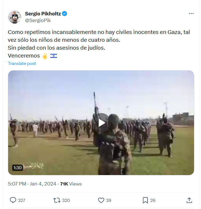 Pikholtz había publicado en su cuenta de la red social X un video de miembros del movimiento islamista palestino Hamas y escribió: "Como repetimos incansablemente no hay civiles inocentes en Gaza, tal vez solo los niños de menos de cuatro años. Sin piedad con los asesinos de judíos. Venceremos".