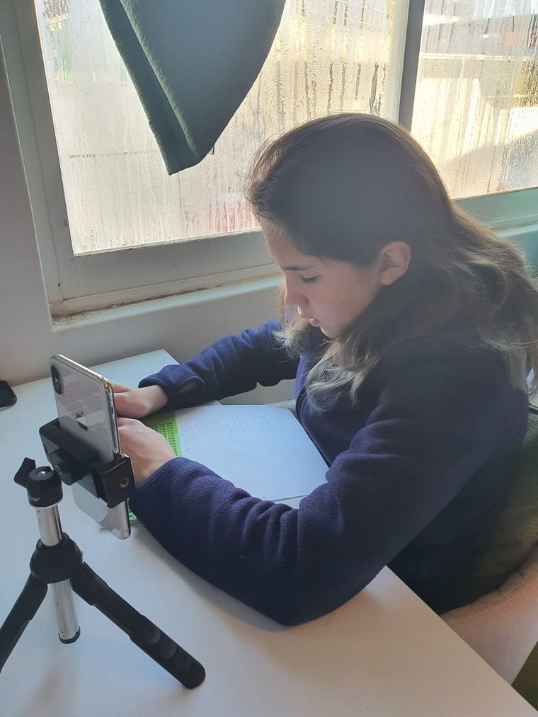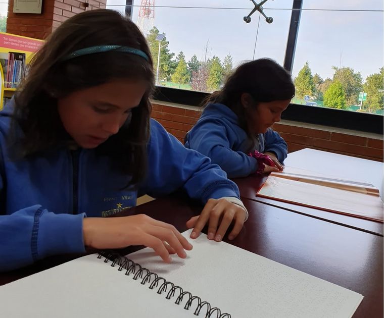 Aprendió a leer en braille, a los cuatro años y también sabe escribir en letras visuales en imprenta mayúscula.