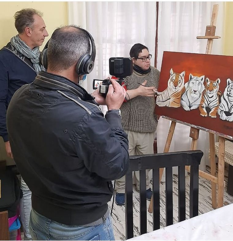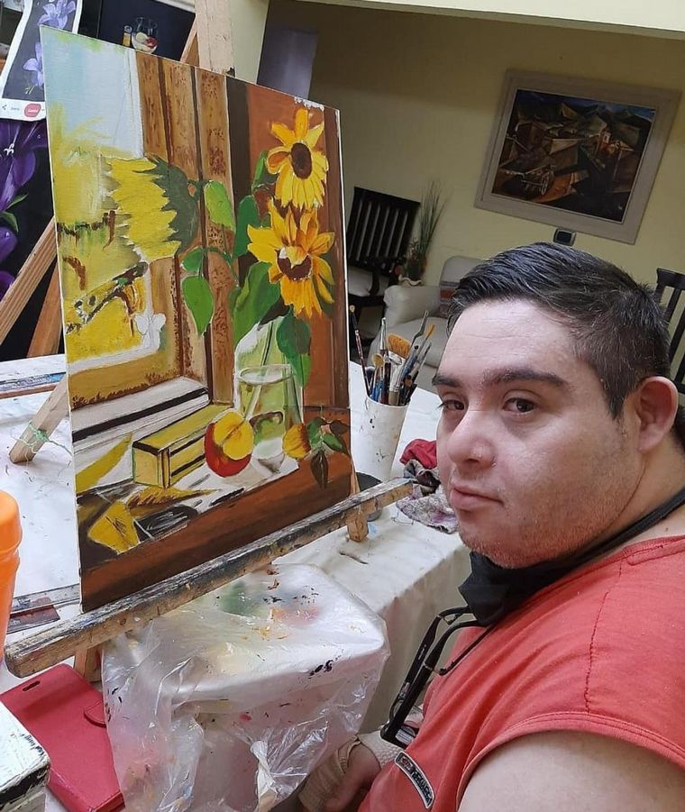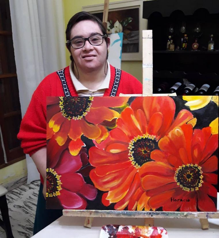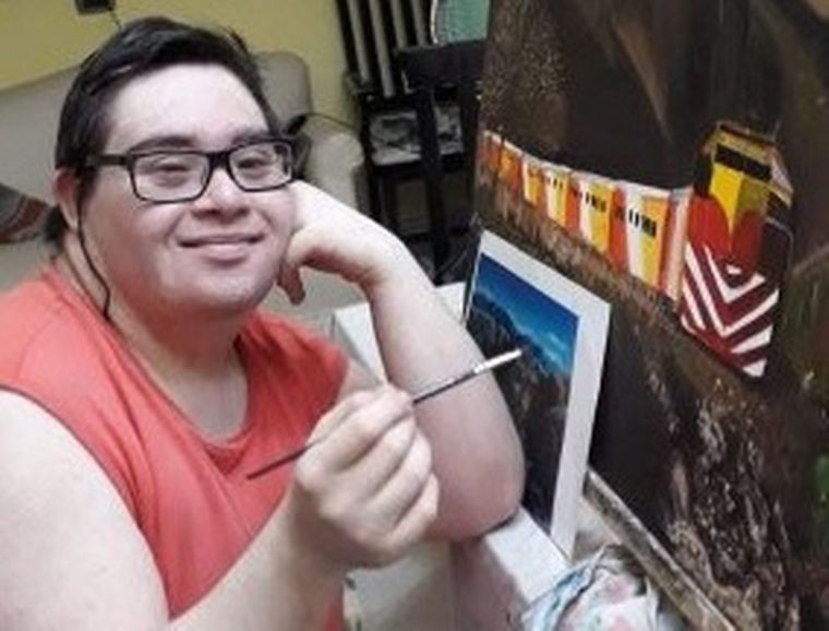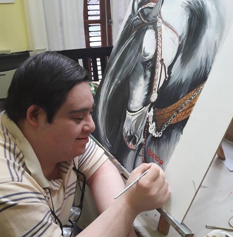 Horacio Medina tiene 35 años, nació con síndrome de Down y desde chico le gustó dibujar. Su familia lo incentivó en este camino y tras vender su primer cuadro decidió seguir con este camino.