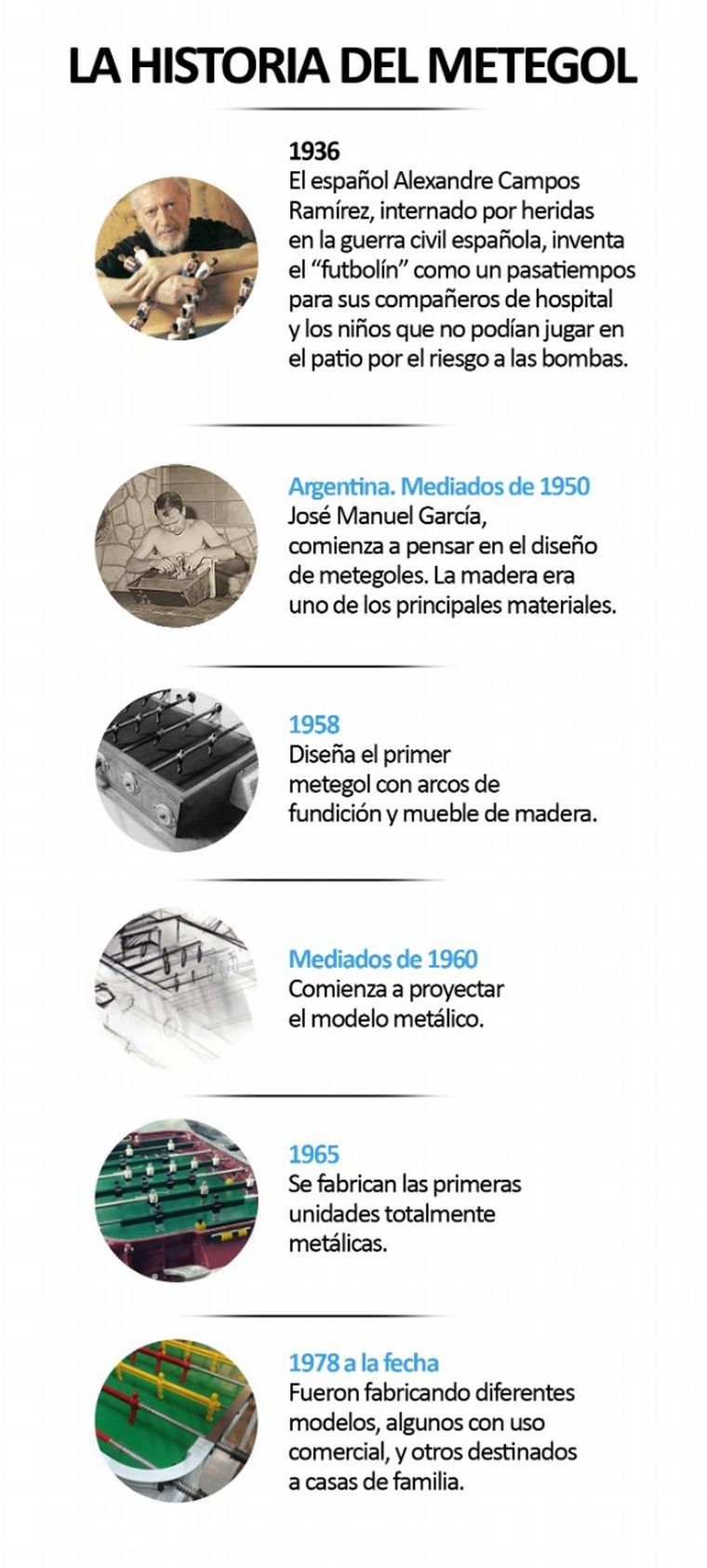 El origen del metegol en el mundo se le adjudica a varias personas, pero Néstor asegura que la historia que más le gusta a él, es la que tiene que ver con un hombre que tras tener un accidente y quedar con problemas de motricidad, ideó un juego para jugar al fútbol con un cajón de verduras.
