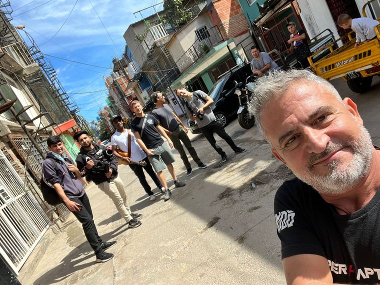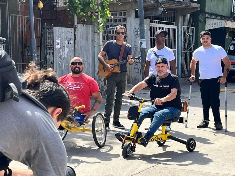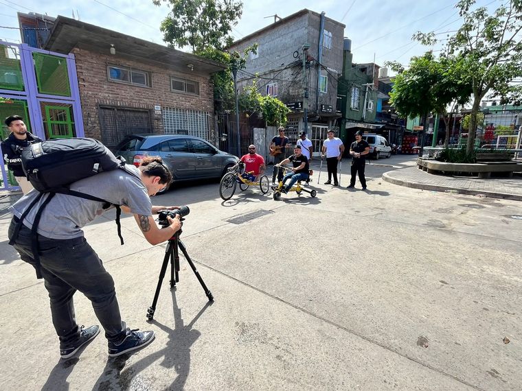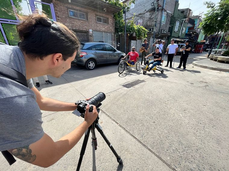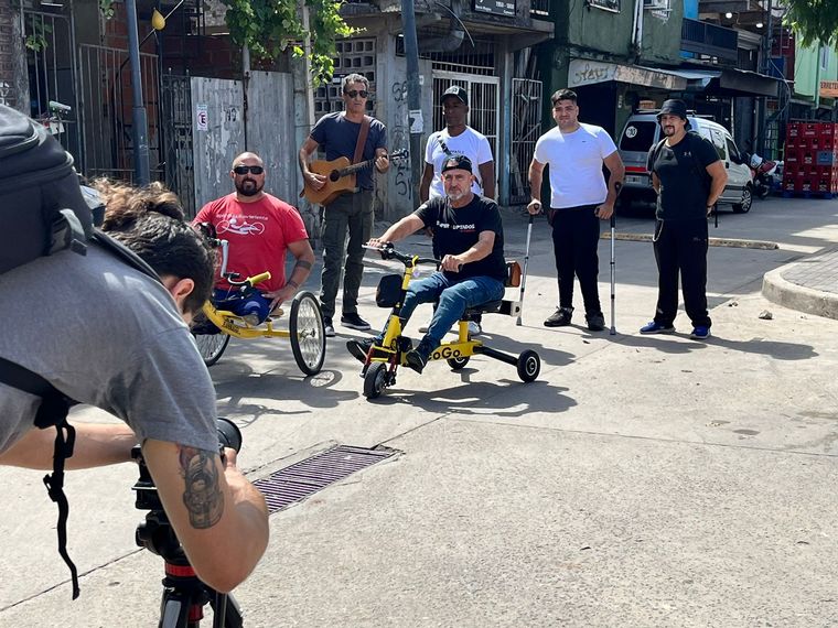 Jean Maggi, creador de la fundación que entrega bicicletas adaptadas para chicos con discapacidad, se encuentra en la Villa 31 filmando un video musical de Gerry Cea y Yadam González Cárdenas.