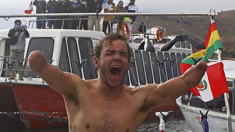 El atleta, a quien le amputaron las extremidades de niño por una meningitis, nadó 122 kilómetros para unir la distancia que separa Copacabana (en Bolivia) de las islas flotantes de los Uros, frente a la bahía de Puno (en Perú).