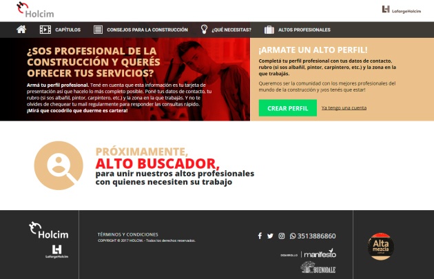 A través de su portal Alta Mezcla, Holcim ha lanzado una nueva sección llamada Altos Profesionales: un buscador de profesionales de la construcción. Allí, albañiles, plomeros, pintores, gasistas, etc. se inscriben, dejan asentado su rubro y la zona en la que trabajan.