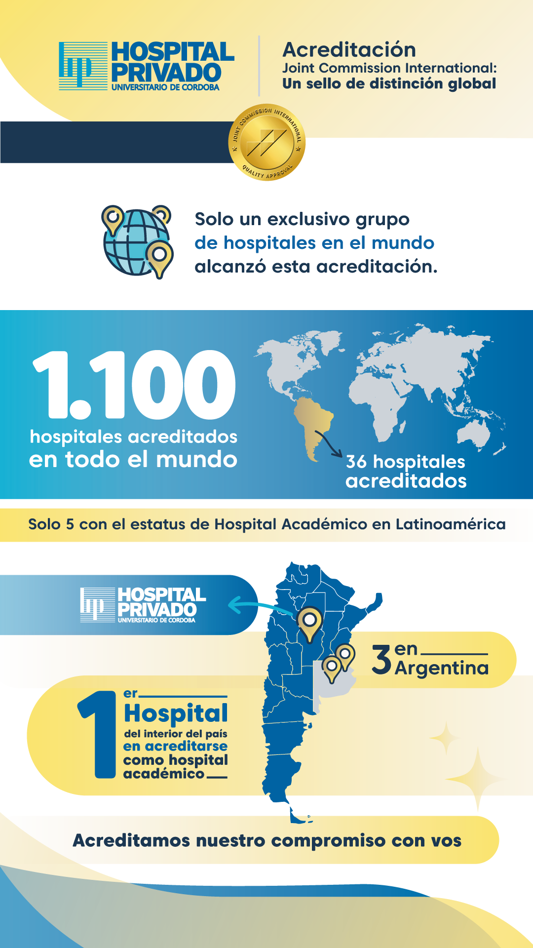 El Hospital Privado Universitario de Córdoba ha alcanzado un importante hito al recibir la acreditación como Hospital Académico por parte de Joint Commission International (JCI). De esta manera se reconoce que la institución contribuye a la investigación científica y a la innovación en el campo de la medicina y que garantiza la más alta calidad en el cuidado de la salud y la seguridad del paciente.