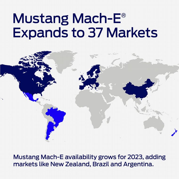 El Mustang Mach-E está disponible en 37 países de todo el mundo en 2023, frente a los 22 del primer año del vehículo. Argentina, Brasil y Nueva Zelanda se encuentran entre los últimos mercados que se sumarán al establo Mustang Mach-E. El crecimiento global se produce en simultáneo con las actualizaciones en la Planta de Estampado y Ensamblaje de Cuautitlán, que construyó el vehículo número 150,000, para poder atender la alta demanda.