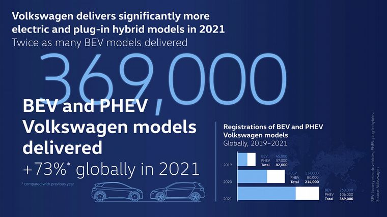 Más de 369.000 vehículos eléctricos entregados en todo el mundo en 2021. Uno de cada cuatro vehículos entregados por Volkswagen en Alemania es un BEV (Auto con motor elécrtico y batería) o bien un PHEV (motor eléctrico, batería y motor de combustión)