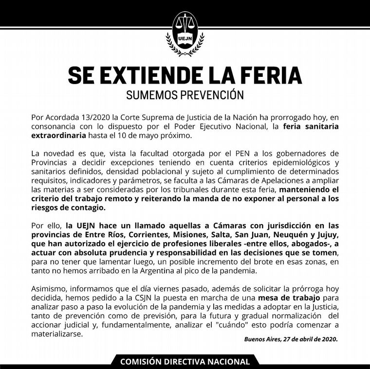 De todos modos, aclaró: “Finalizada esa etapa y empezando con la flexibilización, es indispensable que el Poder Judicial, que es uno de los tres poderes del Estado y cuya función es esencial y en particular en situación de crisis, retome su funcionamiento”.