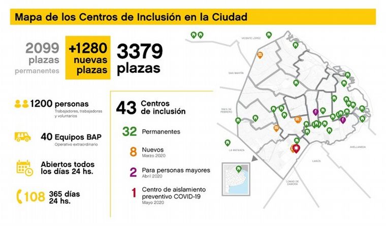 En el contexto de la pandemia, en marzo se abrieron en Capital Federal ocho nuevos Centros de Inclusión, con instalaciones de centros polideportivos. También decidieron la apertura 24 horas los siete días de la semana de todos los existentes.
