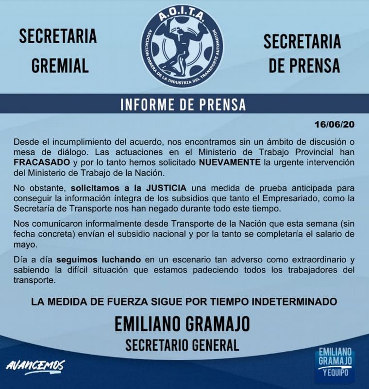 El secretario general del gremio, Emiliano Gramajo, dijo a Cadena 3 que se pedirá la intervención de la cartera nacional, porque "los empresarios no respetaron el acuerdo". El servicio sigue parado.