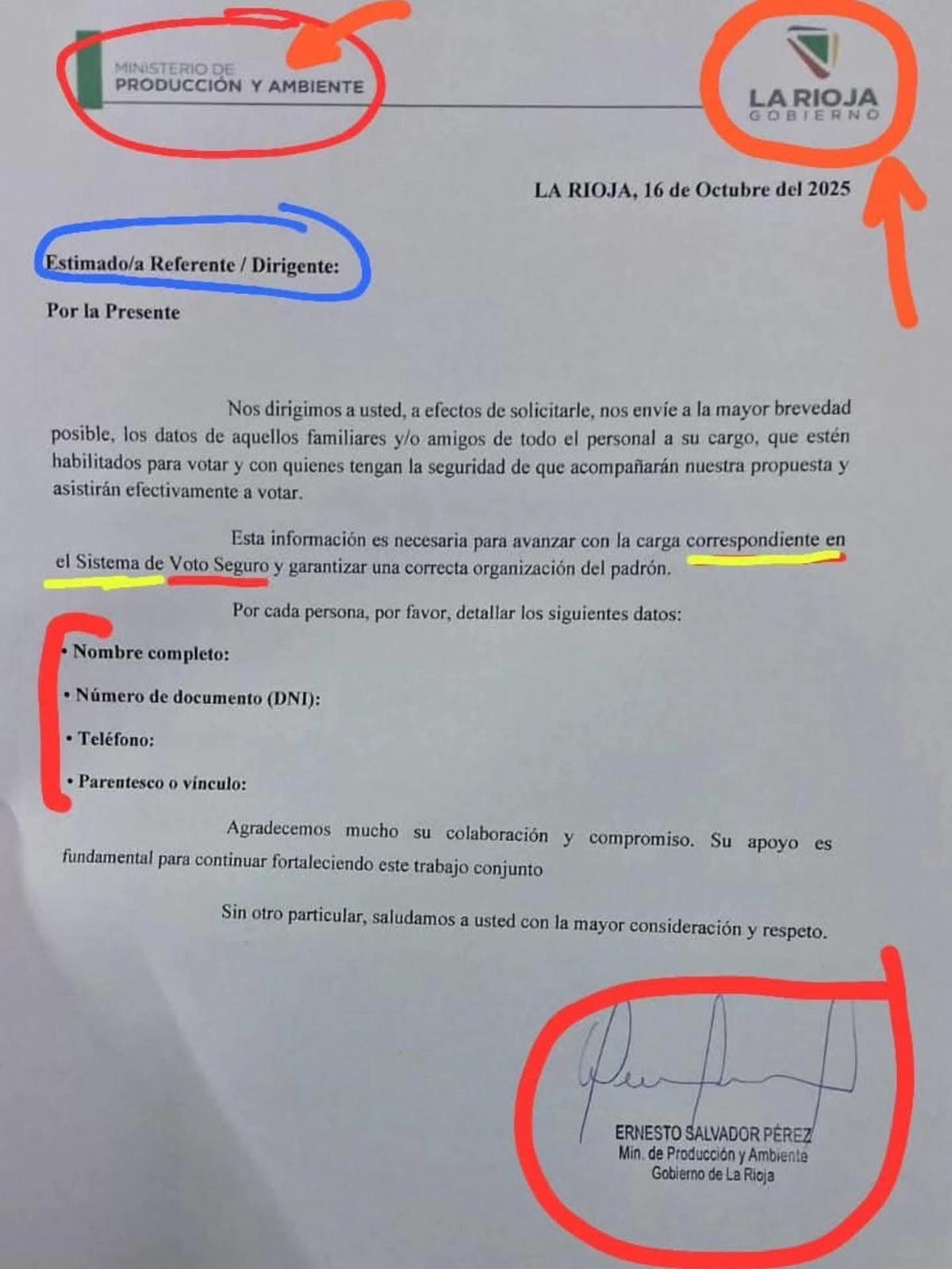 El concejal presentó como evidencia una nota oficial del Ministerio de Producción y Ambiente que exige el listado de los trabajadores públicos. "Esto se ha convertido en el apriete que siempre lo habían hecho, pero ahora lo hacen descaradamente de forma oficial", señaló.