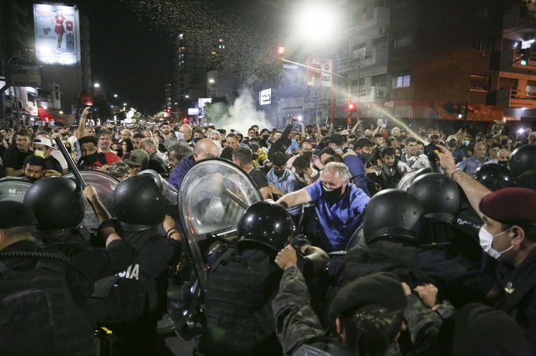 Pese a ello, pasadas las 19, se produjeron algunos forcejeos con vecinos. Además, un grupo de personas derribó el vallado puesto para que los manifestantes no lleguen hasta la comisaría y los policías armaron un cordón con los escudos.