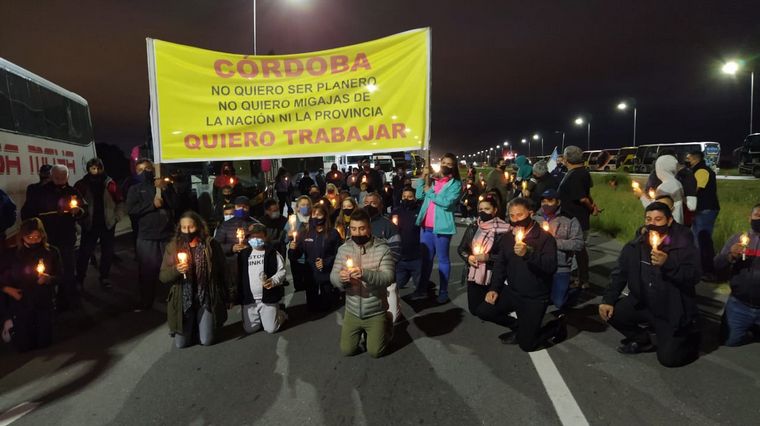 Los manifestantes prendieron velas y cortaron totalmente la autopista Córdoba-Rosario. Están impedidos de desempeñar sus tareas por un DNU del Gobierno nacional.