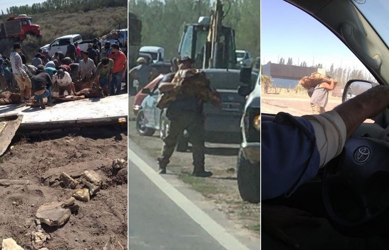 “En una curva, se produce la rotura de la parte lateral, cayendo sobre banquina de la ruta 143. Por calles alternativas, empezaron a aparecer vehículos y las personas, que se trasladaban en los mimos, comenzaron a cargar las medias reses y se llevaron la totalidad de las carnes que estaban en la tierra”, detalló el uniformado.