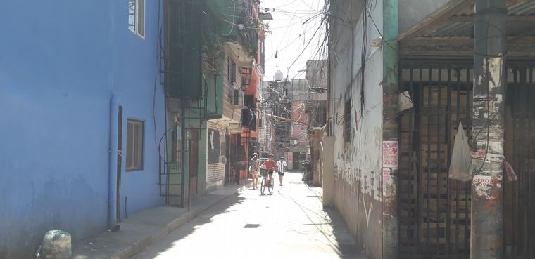 Basta comenzar a caminar con ellos hacia las profundidades del asentamiento para toparse con otra realidad, a la que no llegó la urbanización. En una pequeña calle "techada" de cables, en medio de las construcciones sin revoque que año tras año fueron creciendo hacia arriba, un verdadero mercado se abre paso: puestos de comida, artefactos electrónicos, verdulerías, celulares, panadería, ropa... un puesto al lado del otro a lo largo de 500 metros que muestran un andar incesante de personas. De fondo, los parlantes atronan con una cumbia infinita.