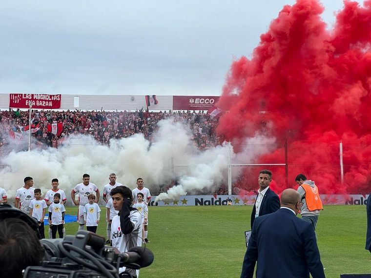 Los hinchas albirrojos prepararon una fiesta en la salida de los equipos con banderas, humo rojo y papelitos. Mira.
