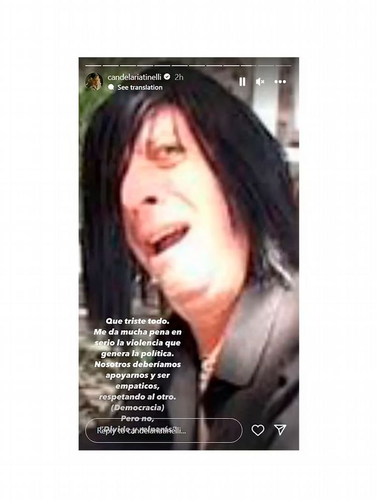 Para concluir con la serie de comentarios, afirmó en un tono más serio: “Qué triste todo. Me da mucha pena en serio la violencia que genera la política. Nosotros deberíamos apoyarnos y ser empáticos, respetando al otro (democracia). Pero no, ‘divide y reinarás’”, aseguró, con una foto del personaje El emo, creado por Diego Capusotto.