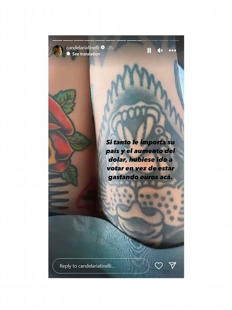 No conforme, Candelaria realizó una serie de historias referidas al tema: “Capaz piensa que soy la ministra de economía”, fue una. “Capaz le molesta que esté en Madrid acompañando a mi pareja... ah, pero pará, ella también está en Madrid, por cierto de compras”, continuó.