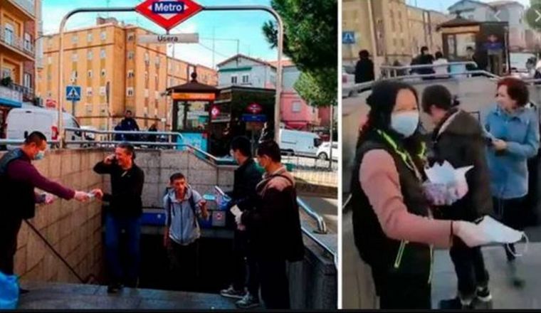 Residentes chinos distribuyen barbijos gratuitamente en la salida del Metro Usera, en Madrid.