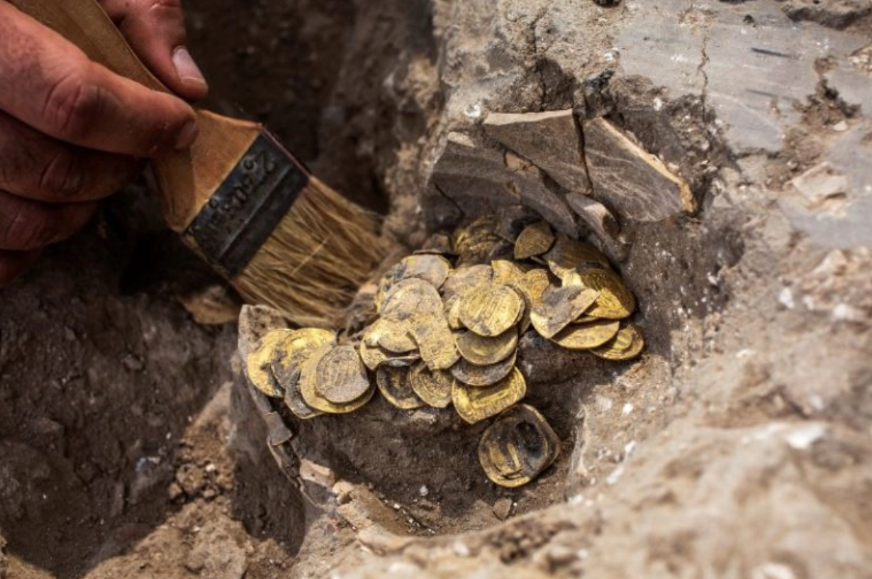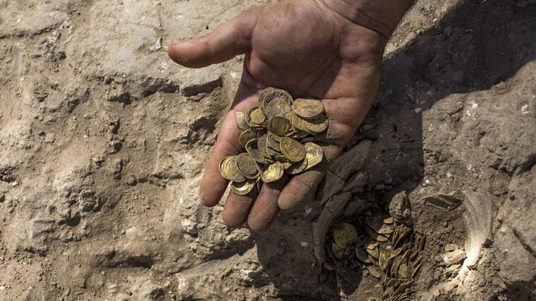 Investigadores desenterraron cientos de monedas de oro guardadas en una vasija de arcilla durante más de 1.000 años en Israel.