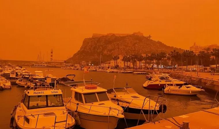 A este fenómeno meteorológico, de fuertes vientos calientes cargados de polvo de arena del desierto del Sahara, se le denomina en España calima.