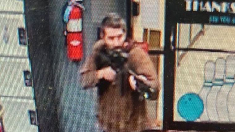El alguacil del condado pidió la ayuda del público para identificar al sospechoso fotografiado, un hombre con barba, camisa de manga larga y pantalones vaqueros, que sostiene un rifle en posición de disparo.