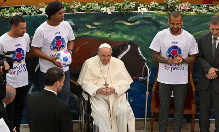 El papa Francisco bendijo este viernes la pelota para el Partido por la Paz durante la presentación del evento en el Vaticano, junto a exjugadores como Ronaldinho, Maximiliano Rodríguez, Dani Alves y el apoyo de muchas estrellas del fútbol mundial.