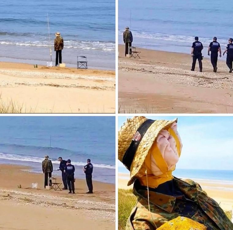 El “hombre” que aparentemente contemplaba el mar junto a su caña de pescar, una silla y su heladera, era en realidad un espantapájaros.