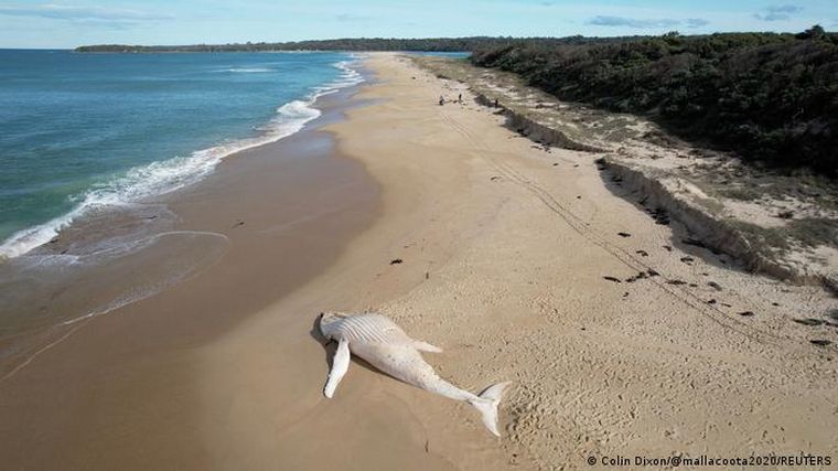 Una rara ballena albina fue encontrada muerta en una playa de Mallacoota, en el distrito australiano de Victoria.