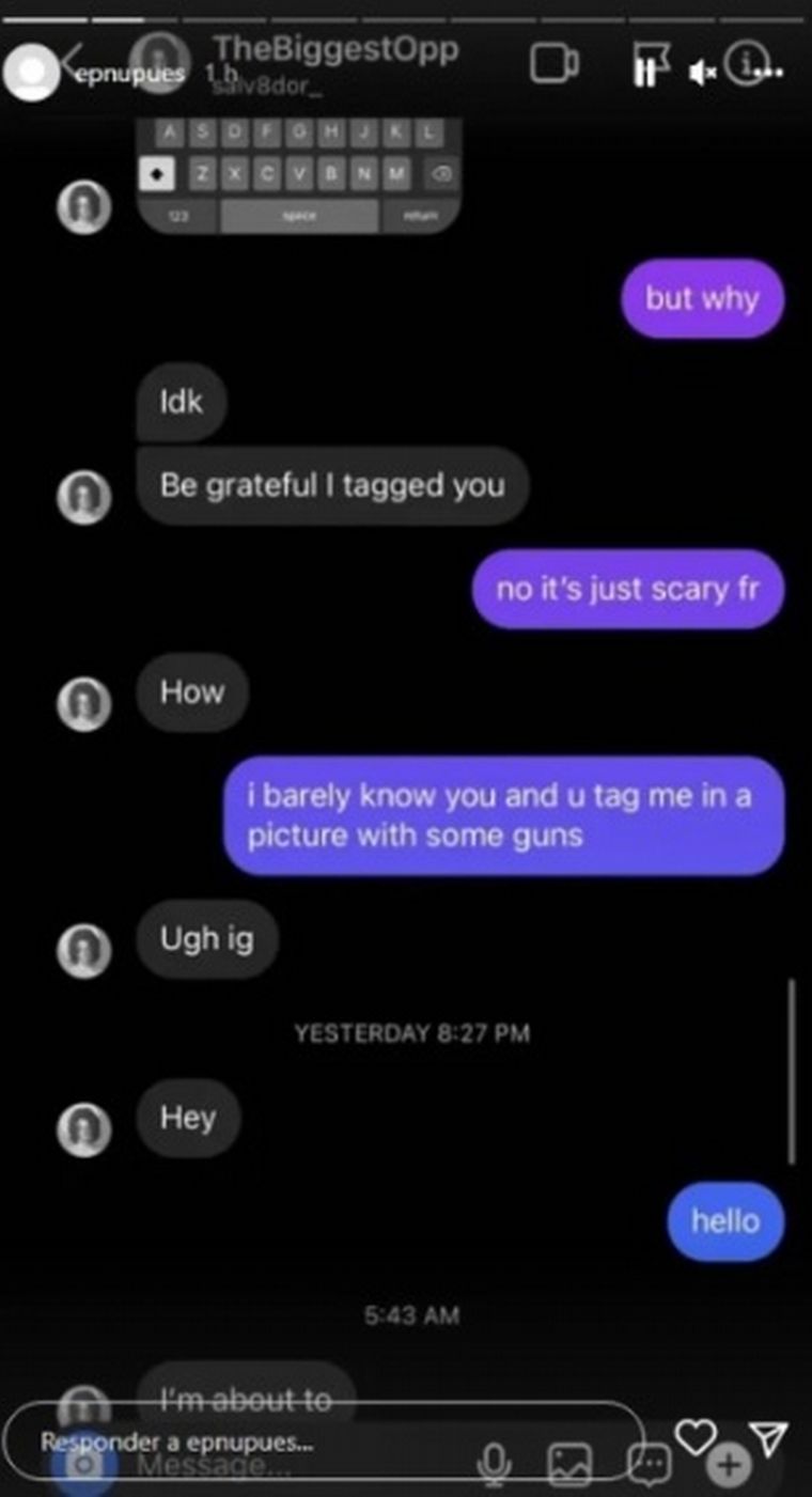 "Sólo quería etiquetarte", fue la respuesta de Ramos. "Agradece que te haya etiquetado", espetó. "No, sólo me asusta fr (manera despectiva de decir fenómeno). "Apenas te conozco y me etiquetas en una foto con unas armas", concluyó ese día la conversación.