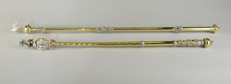 Los cetros: Son dos y fueron creados por el joyero de la corona Robert Vyner en 1661 para la coronación de Carlos II. por un lado, está el cetro con la cruz que representa el poder temporal del rey. Es una barra de oro en cuya punta tiene un Diamante Cullinan I con forma de corazón que fue agregado en el año 1901. Se trata de uno de los diamantes con más colores en el mundo.