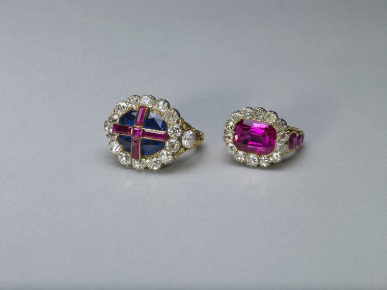 Los anillos: Tras ser ungido con aceite, el arzobispo de Canterbury coloca el anillo en el dedo anular del soberano. Es una pieza con un zafiro octogonal de talla mixta en un engaste de oro recubierto con cuatro rubíes de talla rectangular y uno de talla cuadrada, ensamblados en una tira de oro para formar una cruz con un borde de 14 diamantes y un diamante en cada hombro con un aro de oro.