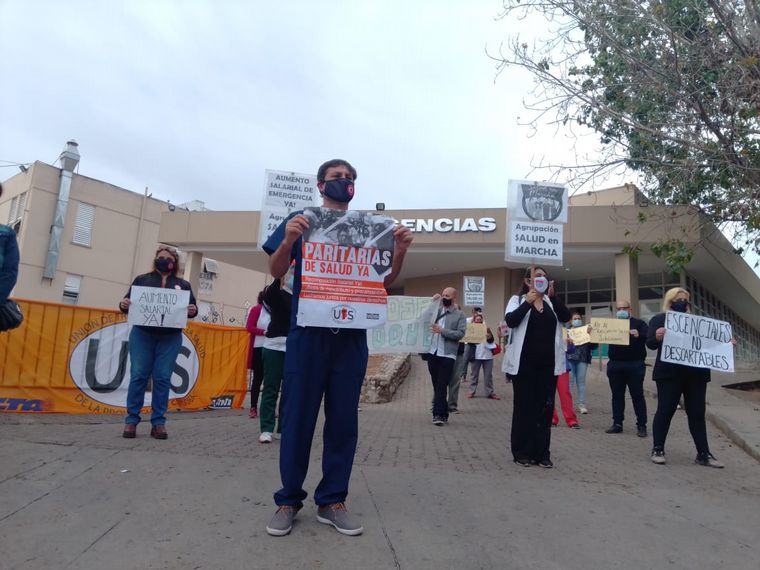 Los trabajadores reclaman por una recomposición salarial urgente (un básico inicial de 50 mil pesos), pase a planta del personal, paritarias, elementos de bioseguridad y la situación epidemiológica (en contra de las últimas habilitaciones y bajas en recursos humanos).