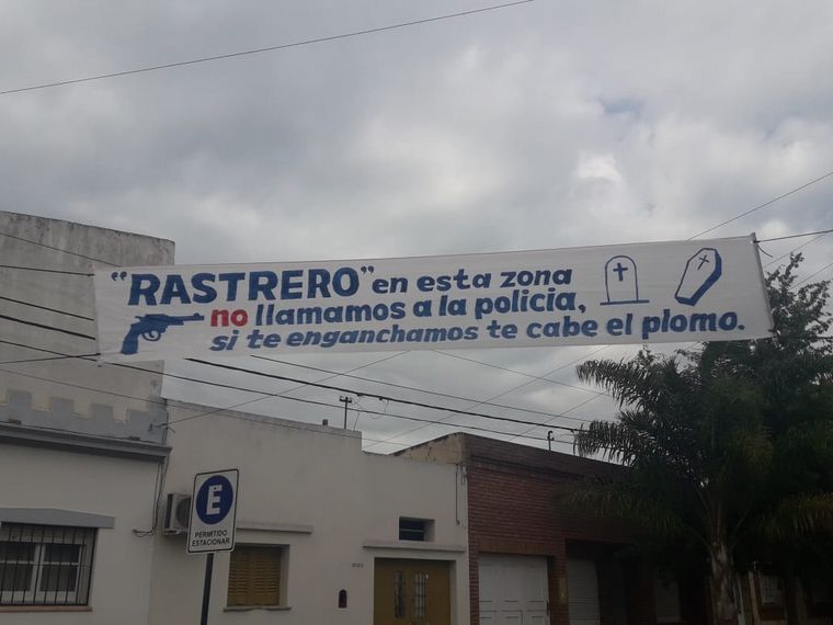 Un pasacalle colgado entre las calles Regis Martínez y Jorge Rodríguez, de barrio Los Hornos, en la ciudad de Santa Fe, advierte a los ladrones que si los ven robando no llamarán a la Policía, sino que les dispararán.
