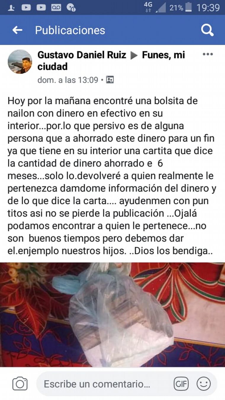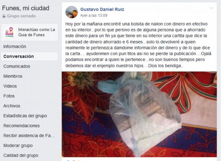 Gustavo Ruiz la encontró en la calle en Funes e inició una campaña para dar con su dueño. El paquete tenía un mensaje que decía para qué era ese dinero.