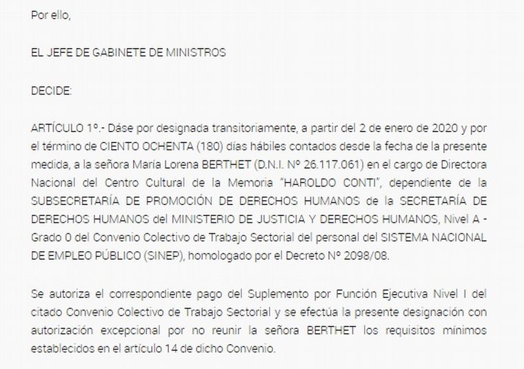 El nombramiento se informó en la Decisión Administrativa 303/2020 del Boletín Oficial con una “autorización excepcional” al no cumplir los requisitos mínimos del art. 14 del Convenio Colectivo de Trabajo Sectorial.